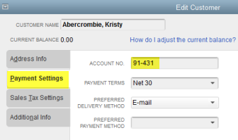 In the example below, let's assume that your other system from which you are exporting your data from utilizes account numbers instead of customer names. Your customer, Abercrombie, Kristy, is referenced in your orders database as customer 91-431. You would then need to go into QuickBooks and on the Payment Settings tab for this customer populate the account no. field with the value 91-431.