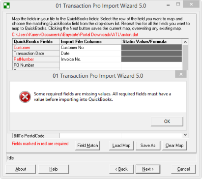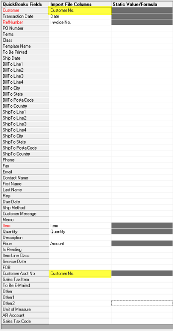 Then, when you get to the Transaction Pro mapping screen, you will map the column, Customer Acct No., to the QuickBooks fields, Customer and Customer Acct No.
