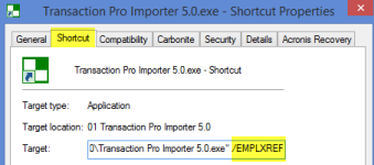 These options are similar to the customer cross reference except for the fact that it needs to be enabled via a command line parameter, -/EMPLXREF. For Transaction Pro Importer 7.0 the command line parameter is /EMPLXREfF. This option is available for time tracking imports only. Follow the instructions below to add this command line parameter.