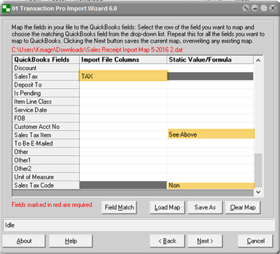 Then, when you get to the Transaction Pro Importer for QuickBooks mapping screen, map the column that contains the tax amount to the QuickBooks Field, Sales Tax. You will then specify default values for both the Sales Tax Item and Sales Tax Code as depicted below.