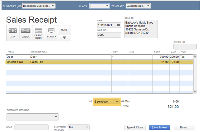 Review the screen shot below. Essentially, what you do is set up a sales tax item in QuickBooks with the name, See Above. Then, you will be able to use an item called, CA Sales Tax, on the body of the invoice with the dollar amount.